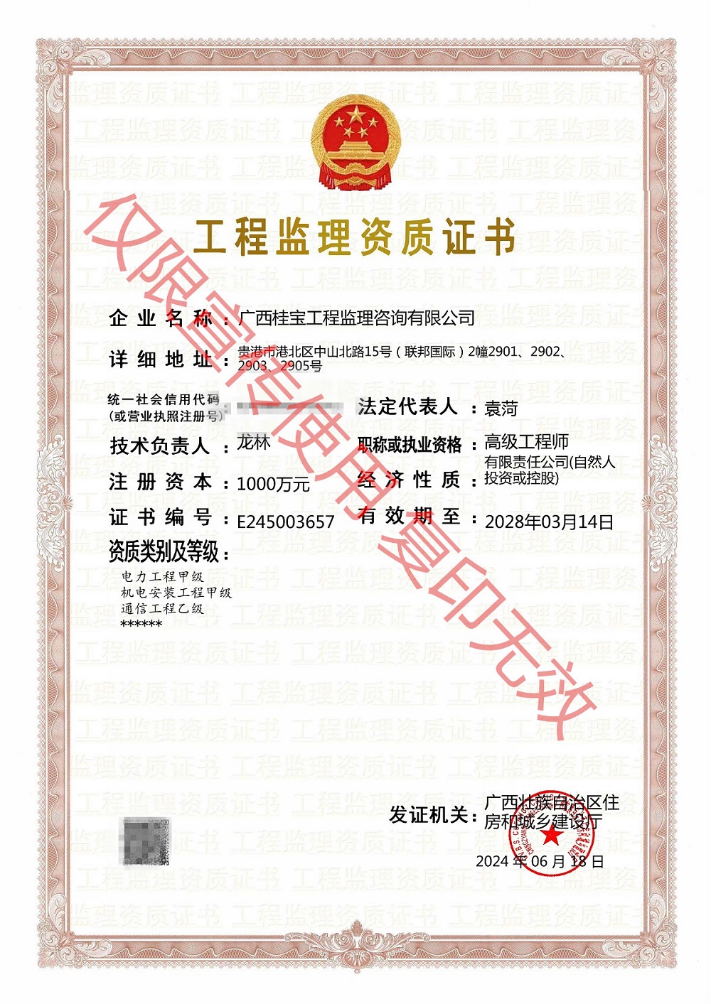 机电安装工程、电力工程监理甲级、通信工程乙级