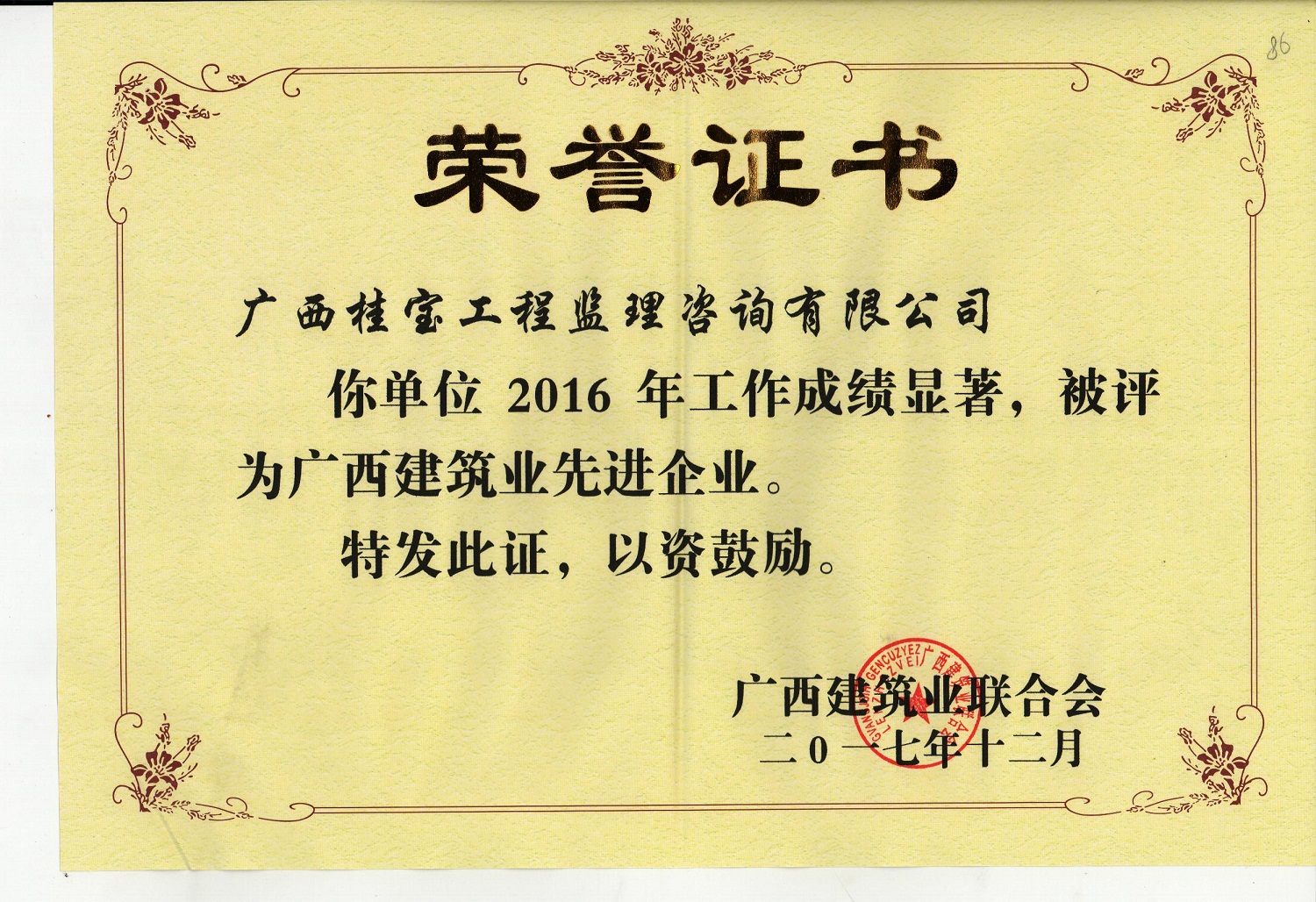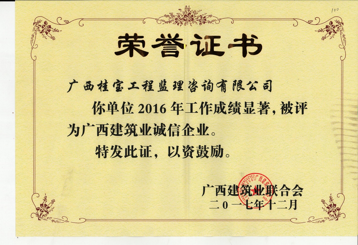 2016年度被评为“广西建筑业诚信企业和先进企业”