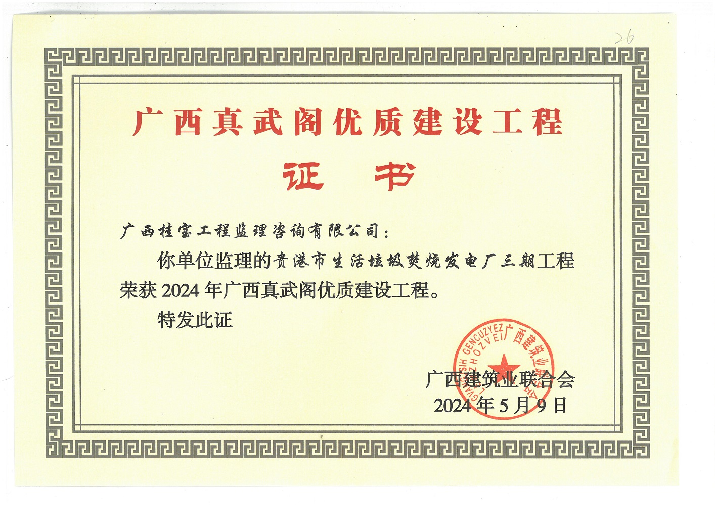 贵港市生活垃圾焚烧发电厂三期工程荣获2024年广西真武阁优质建设工程