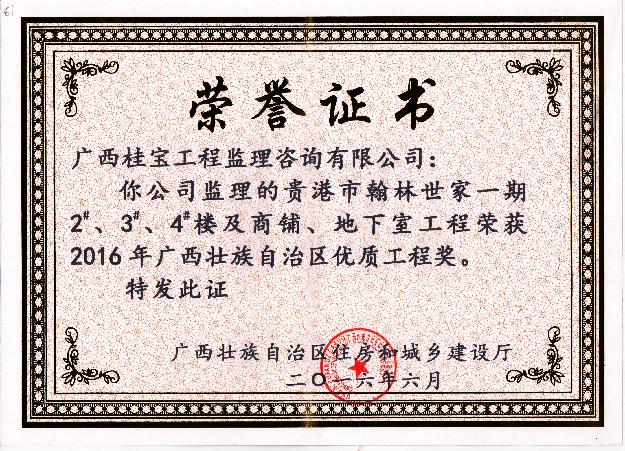桂宝公司监理的贵港市翰林世家一期2#、3#、4#楼及商铺、地下室工程荣获2016年广西壮族自治区优质工程奖