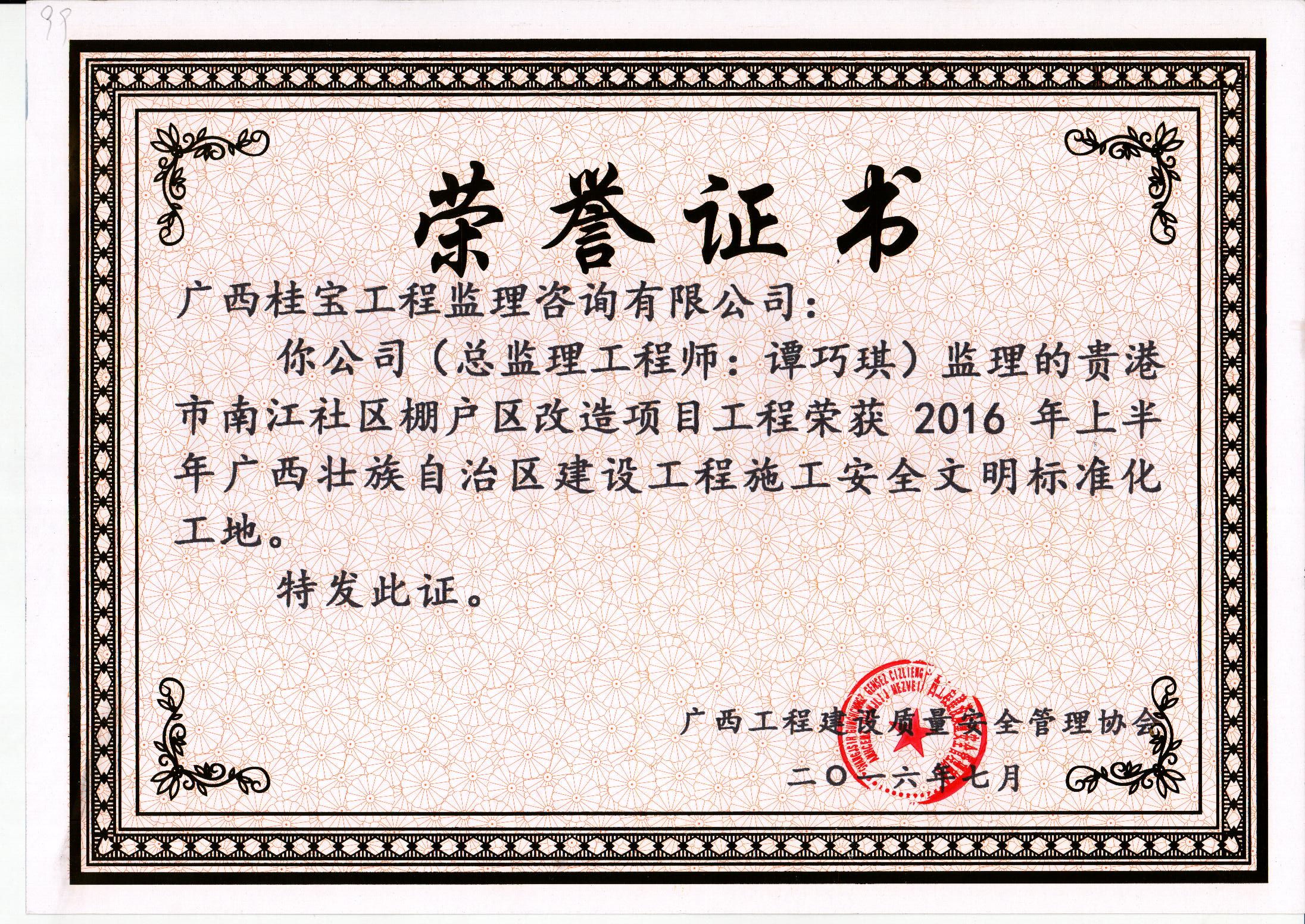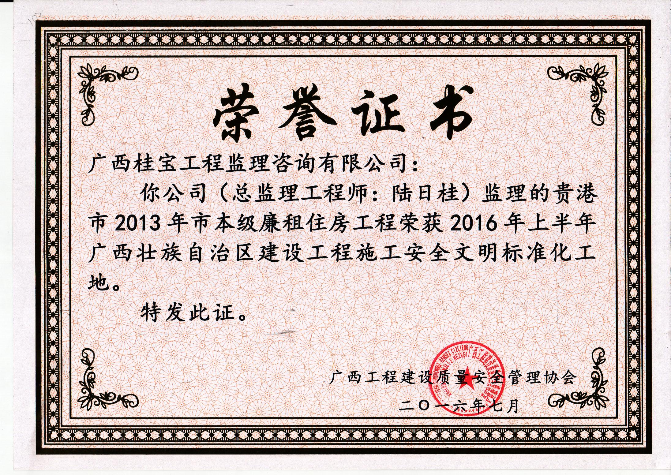 荣获2016年上半年广西壮族自治区建设工程施工安全文明标准化工地