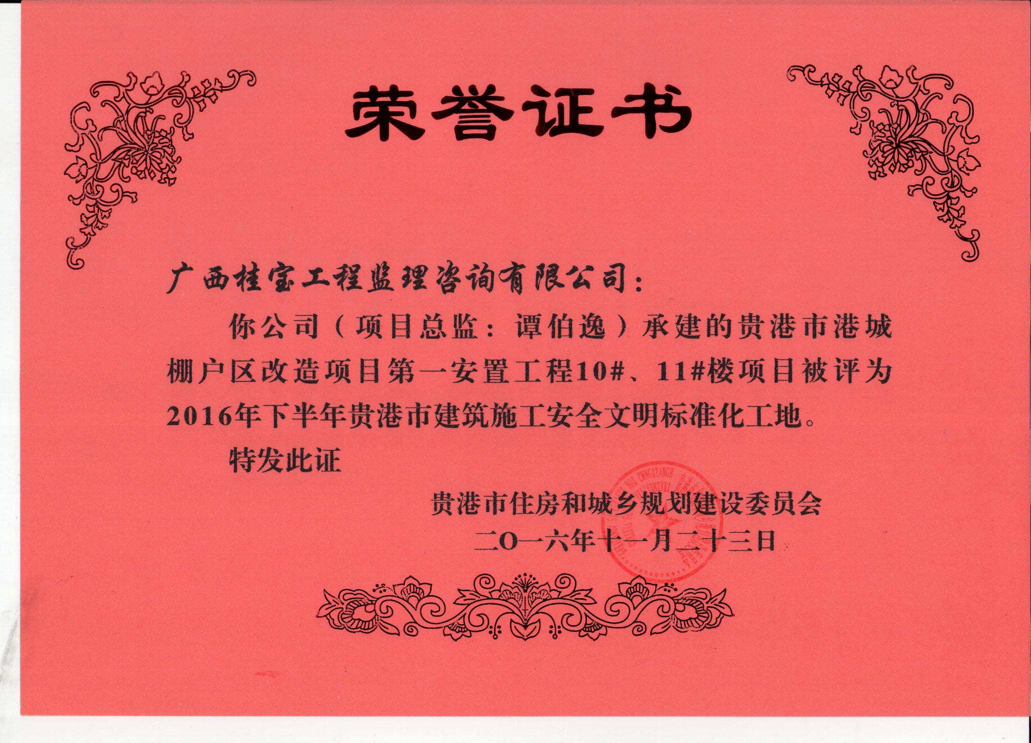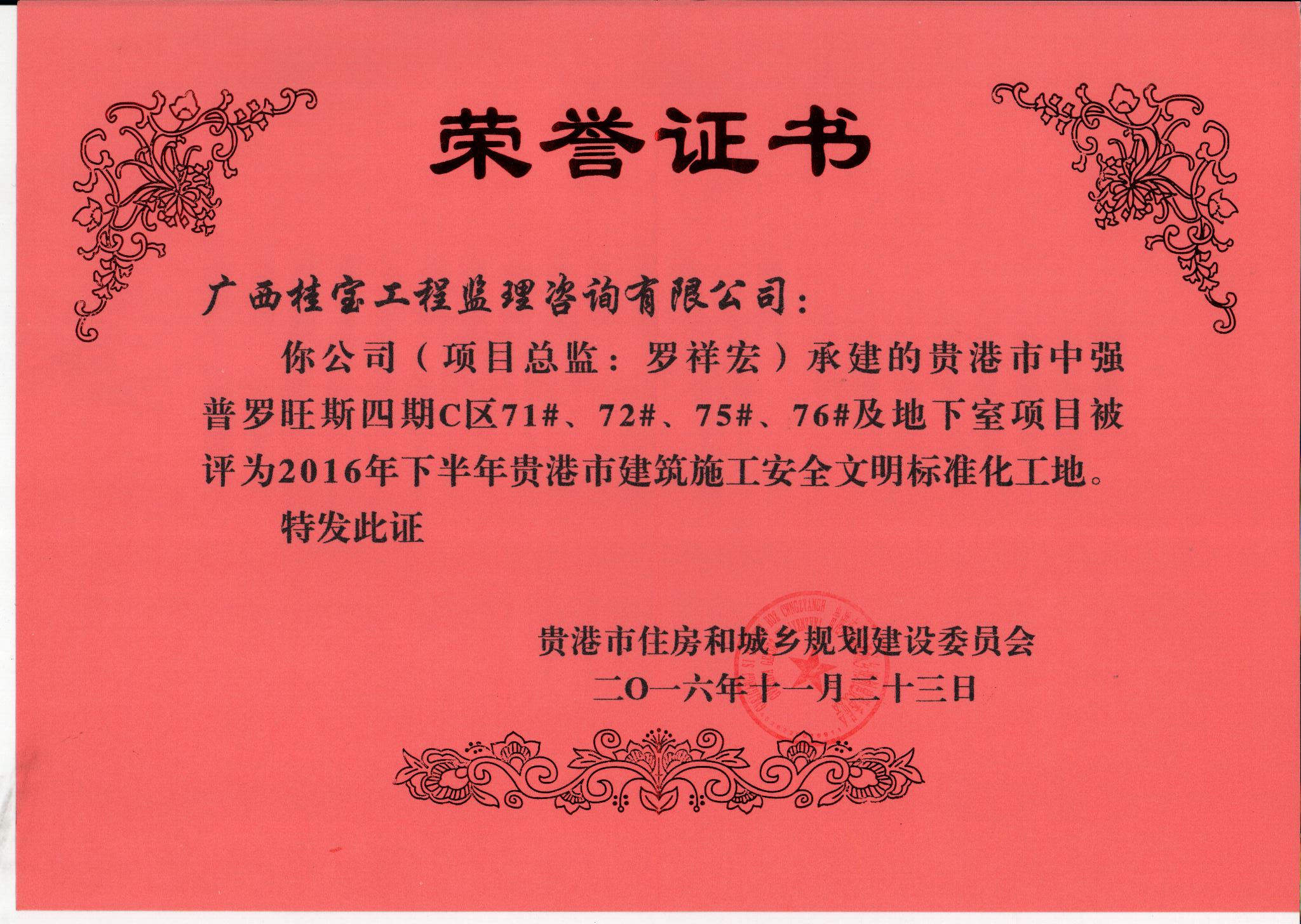贵港市中强普罗旺斯四期C区71#、72#、75#、76#及地下室项目分别被评为2016年下半年贵港市建筑施工安全文明标准化工地
