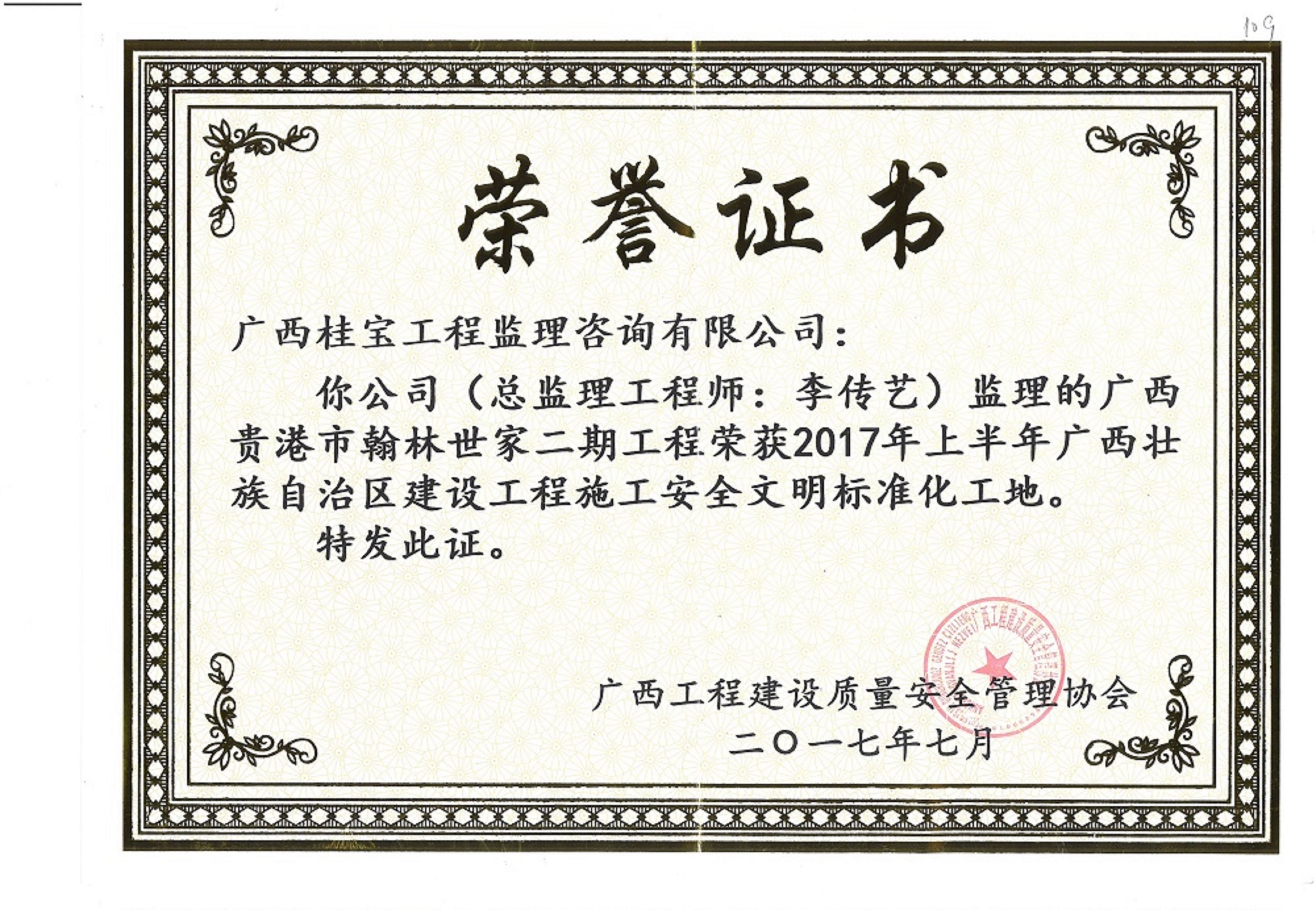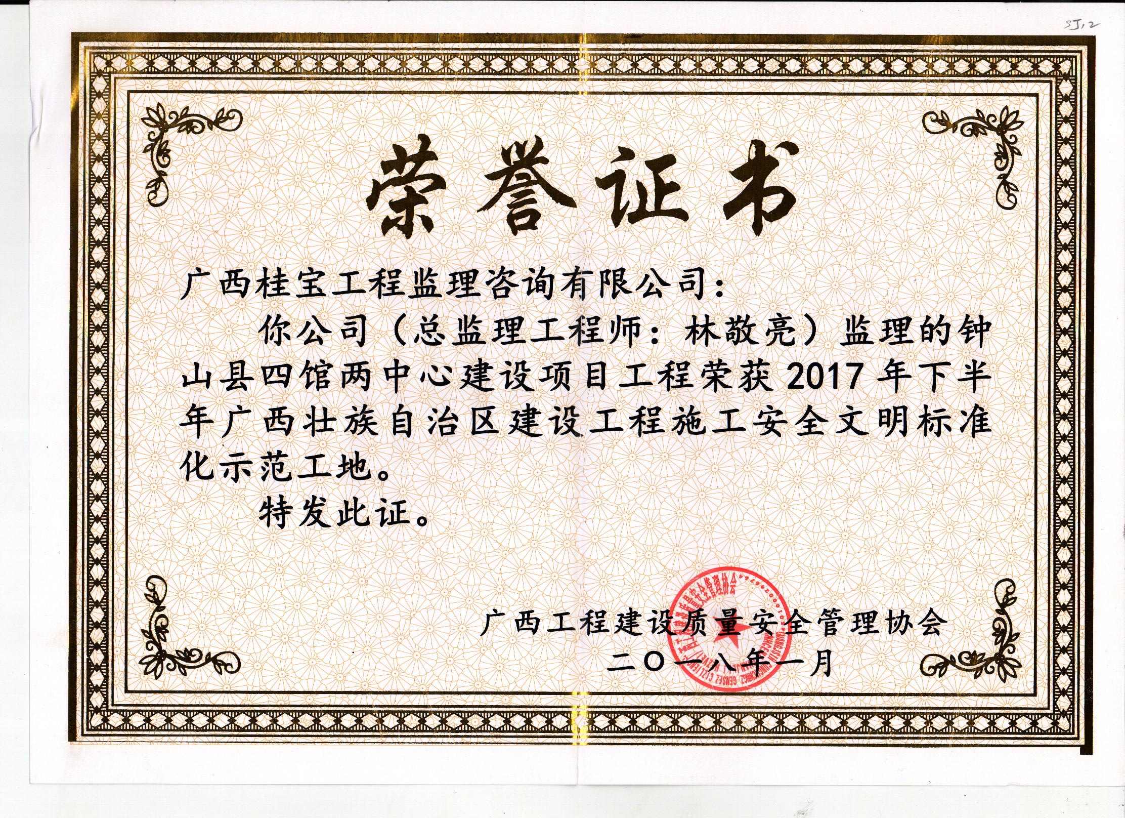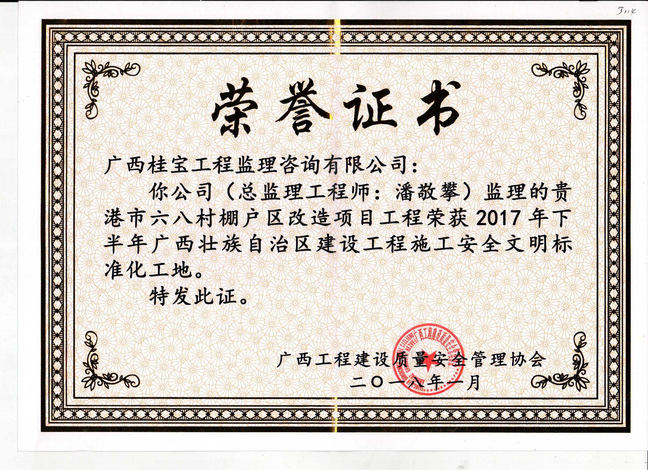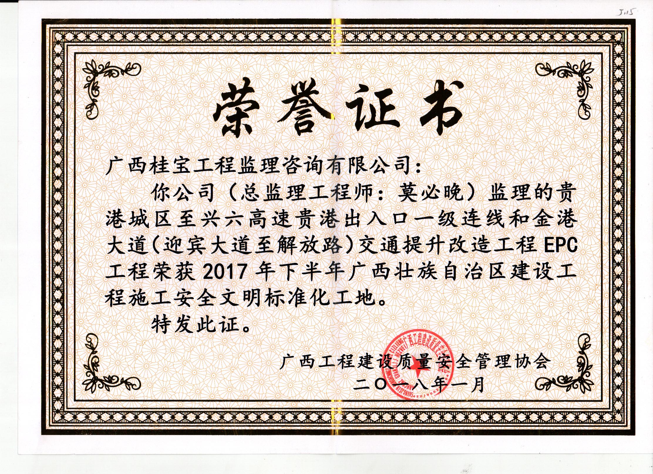 桂宝公司监理的钟山县四馆两中心建设项目工程、贵港城区至兴六高速贵港入口一级连线和金港大道(迎宾大道至解放路)交通提升改造工程EPC工程、广西贵港市翰林世家二期工程、贵港市六八村棚户区改造项目工程分别荣获2017年下半年广西壮族自治区建设工程施工安全文明标准化工地
