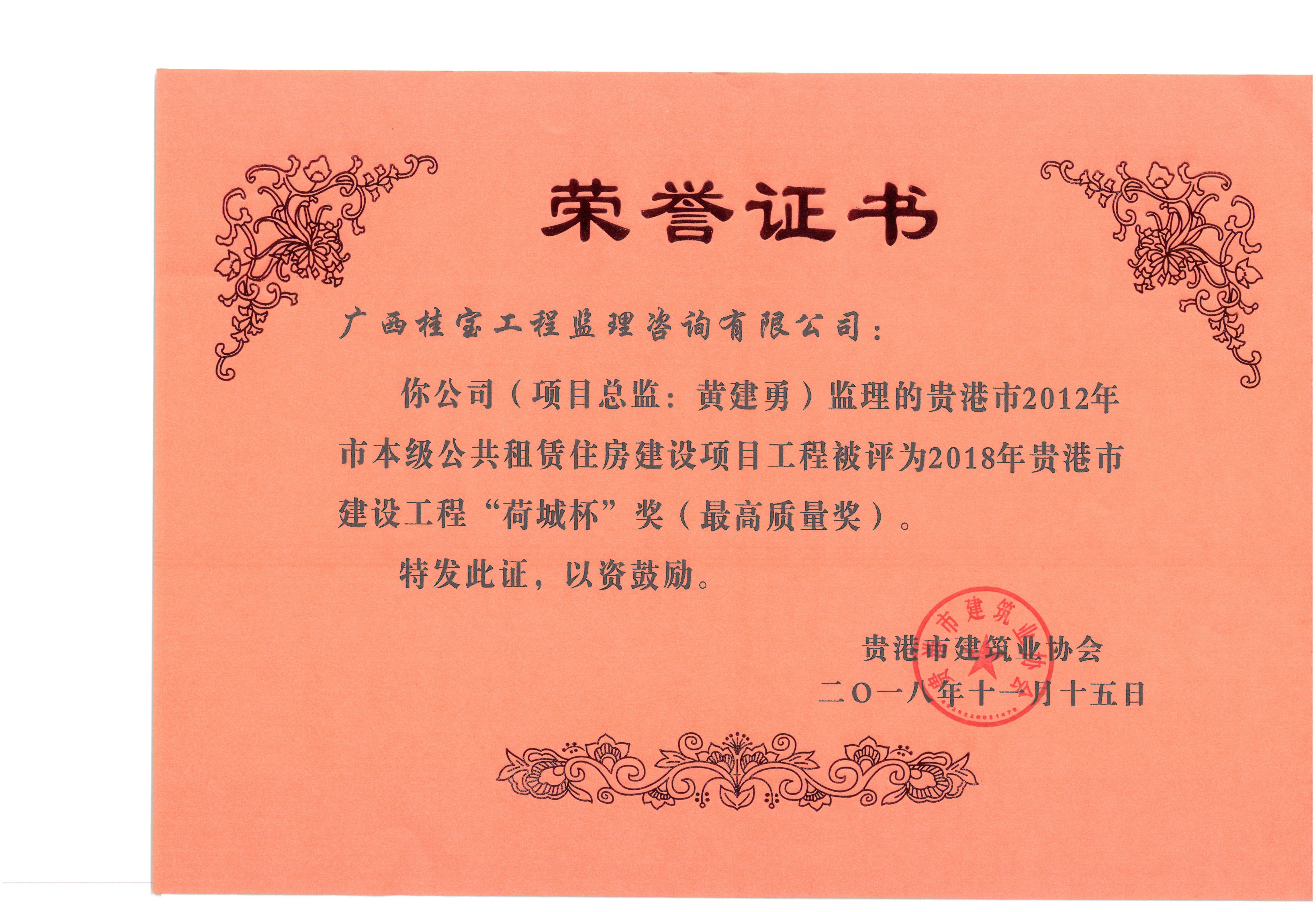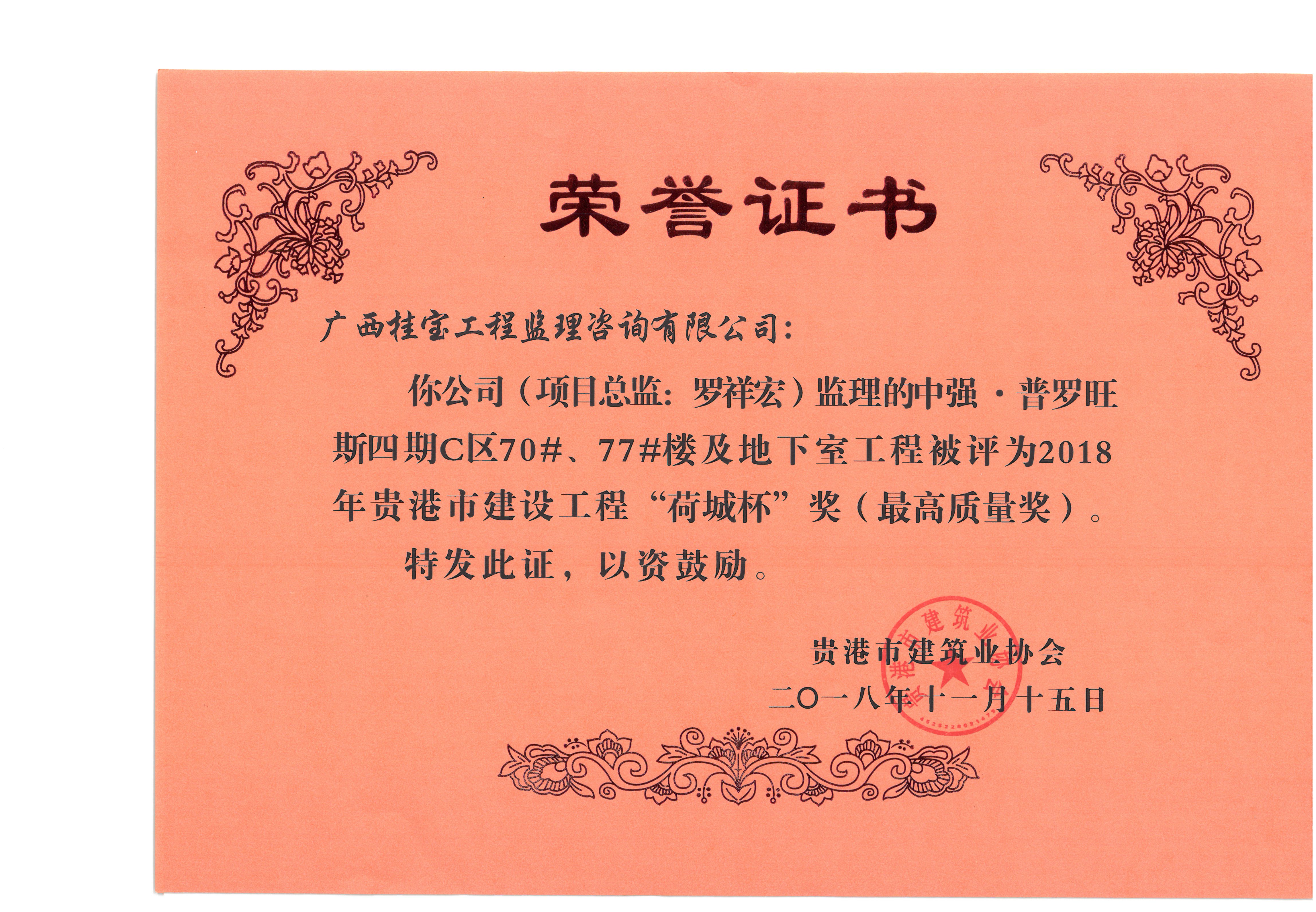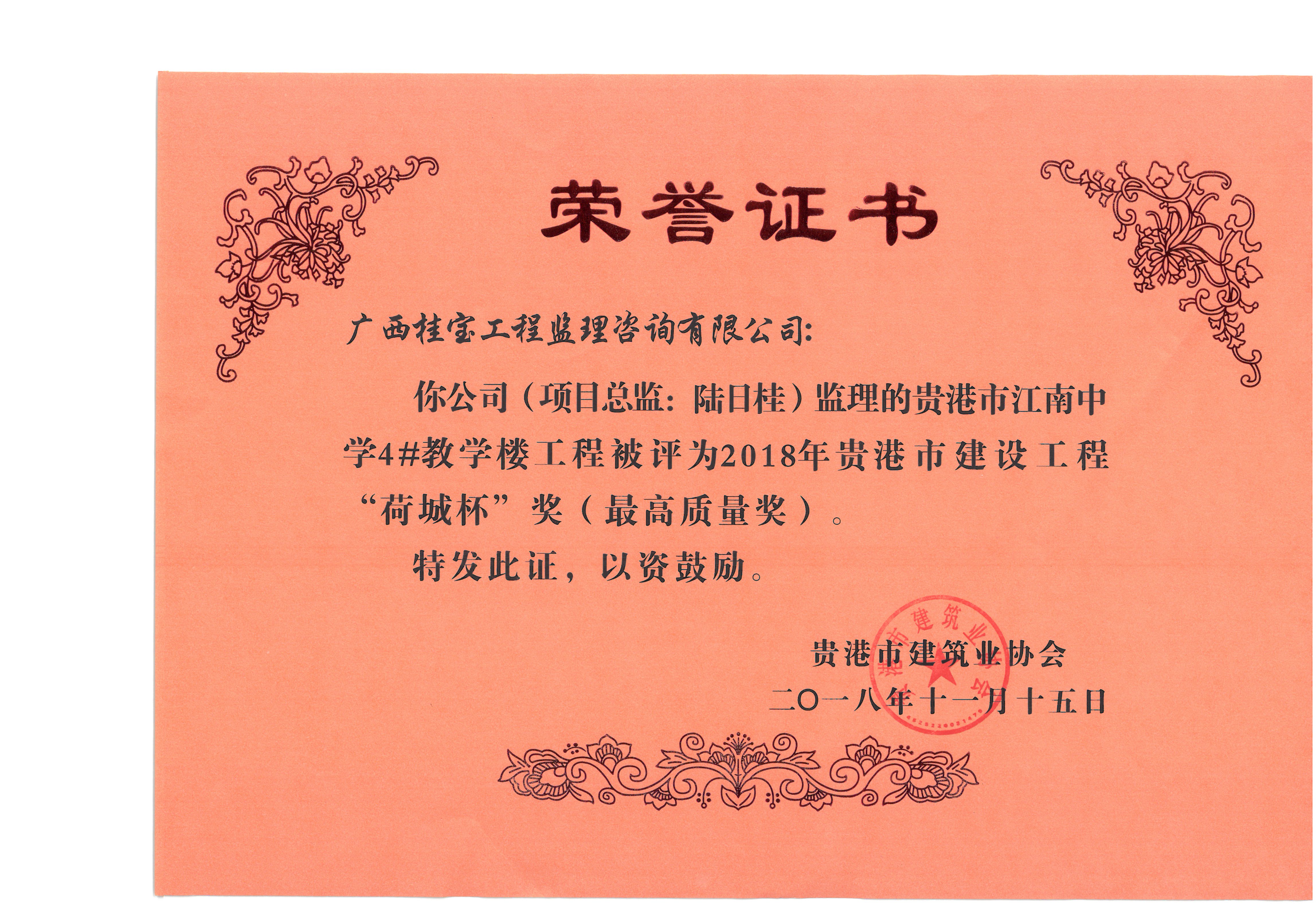 桂宝公司监理的贵港市2012年市本级公共租赁住房建设项目工程、贵港市江南中学4#教学楼工程、中强·普罗旺斯四期C区70#、77#楼及地下室工程分别被评为2018年贵港市建设工程“荷城杯”奖(最高质量奖)