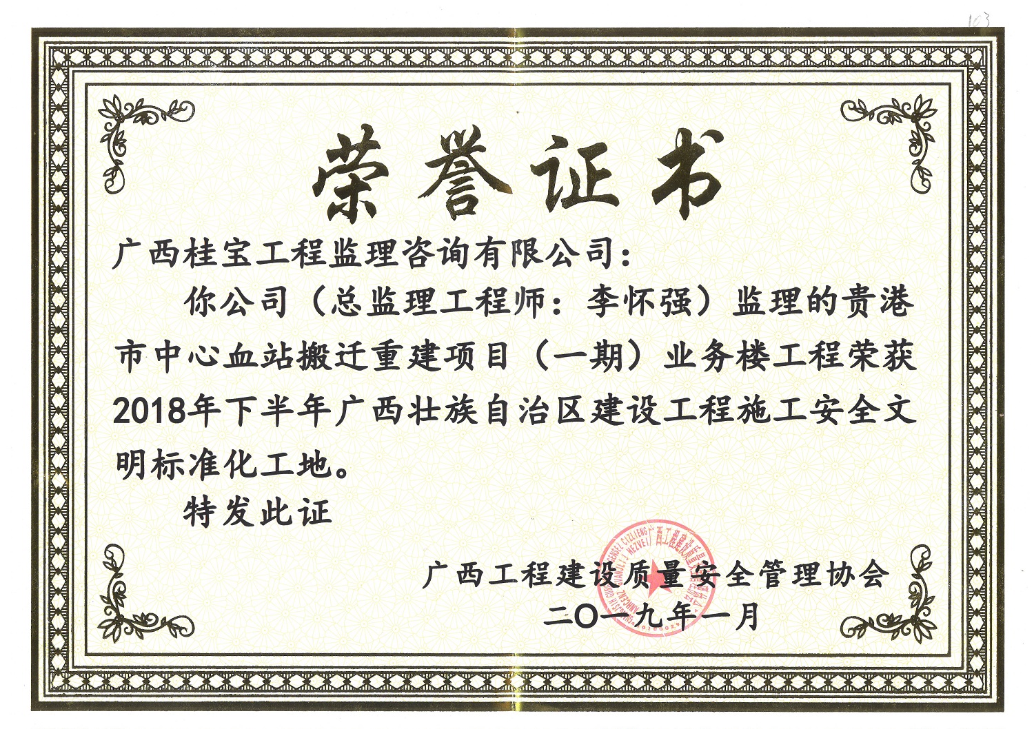 桂宝公司监理的贵港市中心血站搬迁重建项目(一期)业务楼工程荣获2018年下半年广西壮族自治区建设工程施工安全文明标准化工地