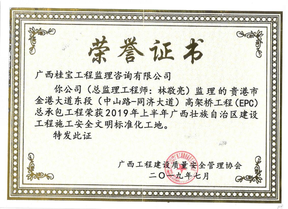 桂宝公司监理的贵港市金港大道东段(中山路—同济大道)高架桥工程(EPC)总承包工程荣获2019年上半年广西壮族自治区建设工程施工安全文明标准化工地