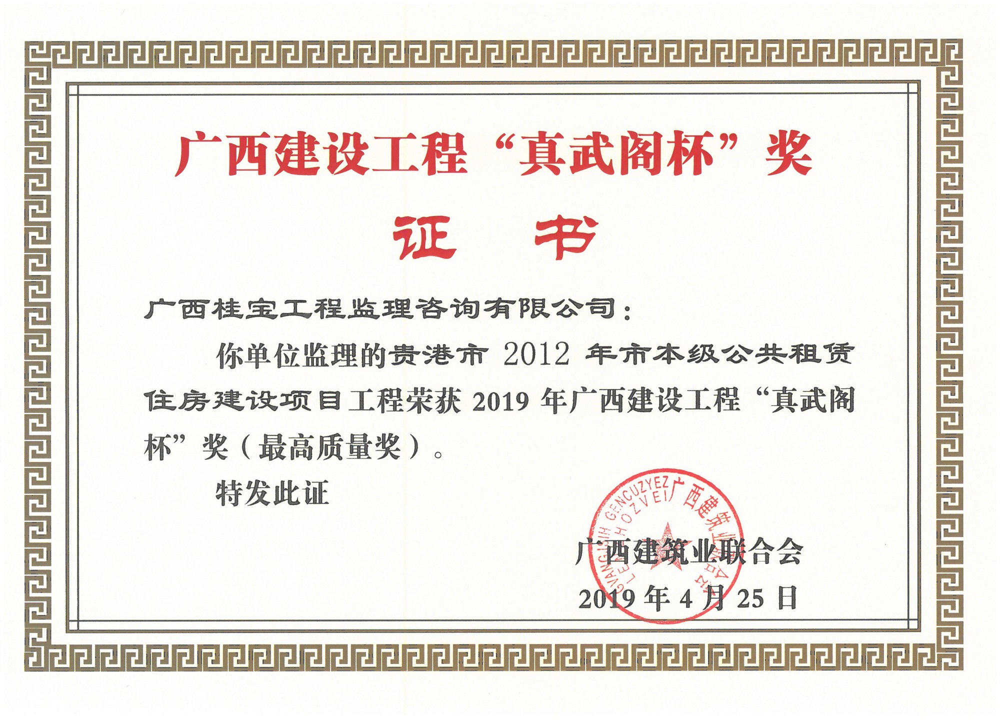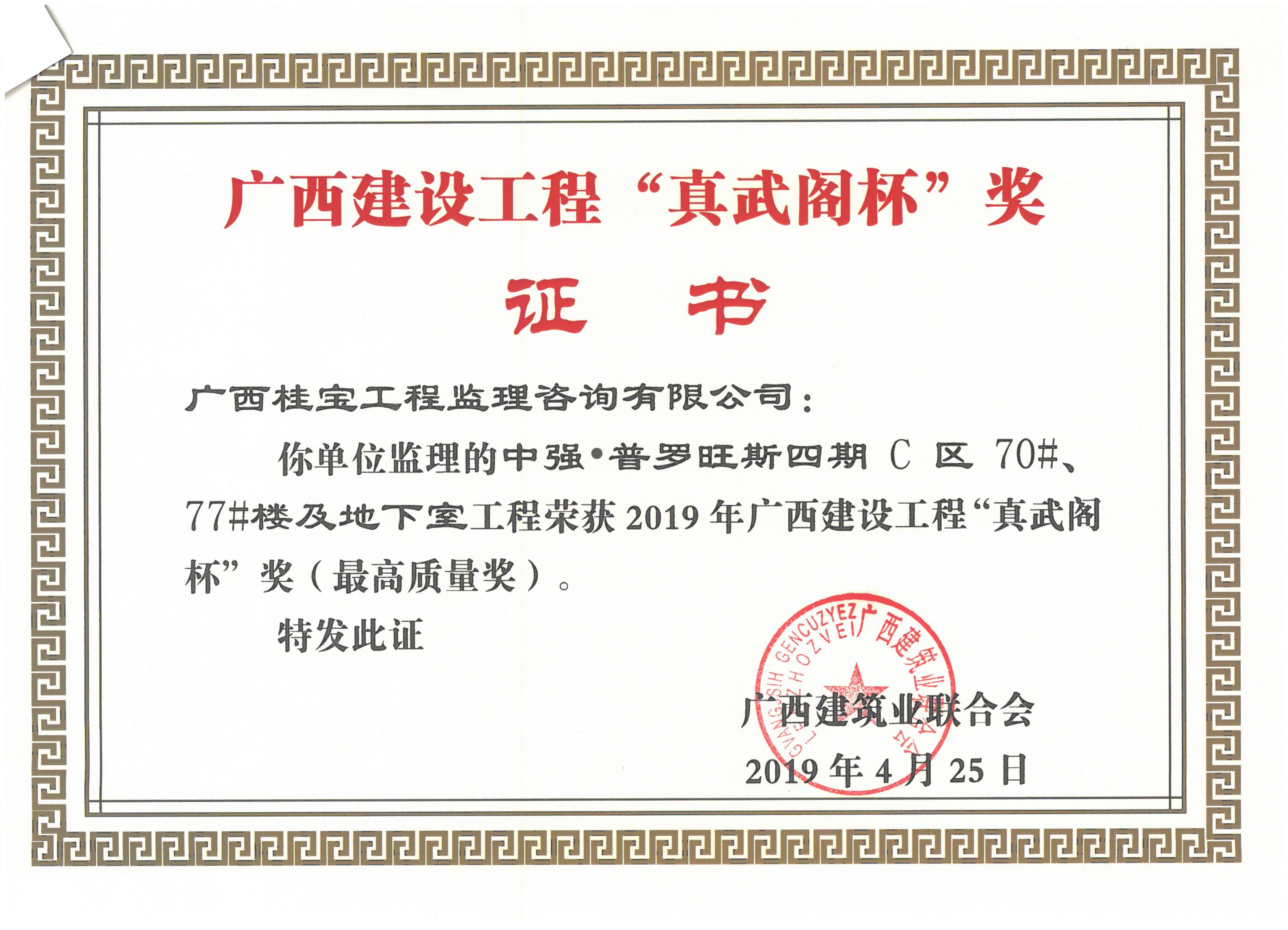 桂宝公司监理的贵港市2012年市本级公共租赁住房建设项目工程、中强·普罗旺斯四期C区70#、77#楼及地下室工程分别荣获2019年广西建设工程“真武阁杯”奖(最高质量奖)