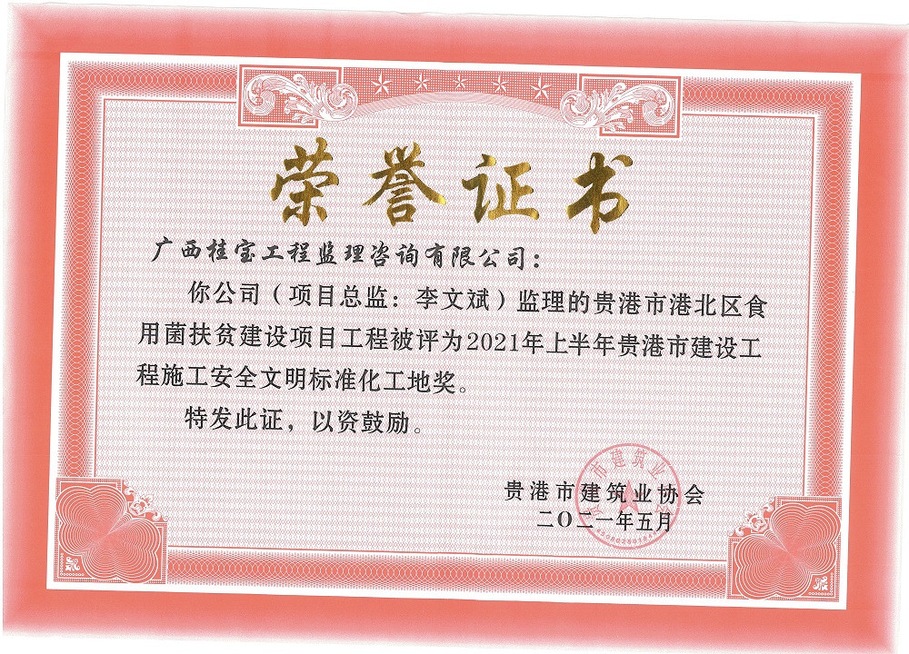 2021年上半年贵港市建设工程施工安全文明标准化工地奖(食用菌)