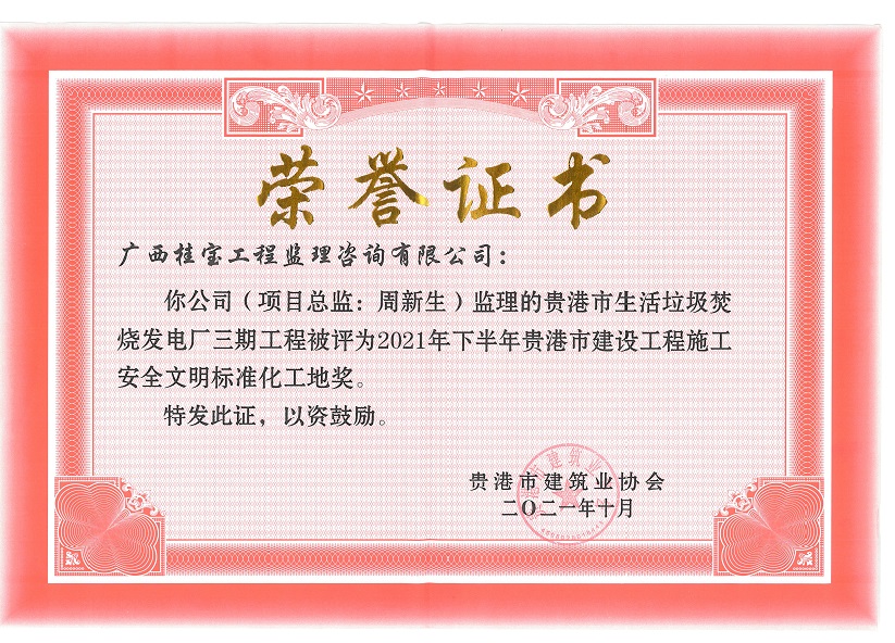 贵港市生活垃圾焚烧发电厂三期工程被评为2021年下半年贵港市建设工程施工安全文明标准化工地奖