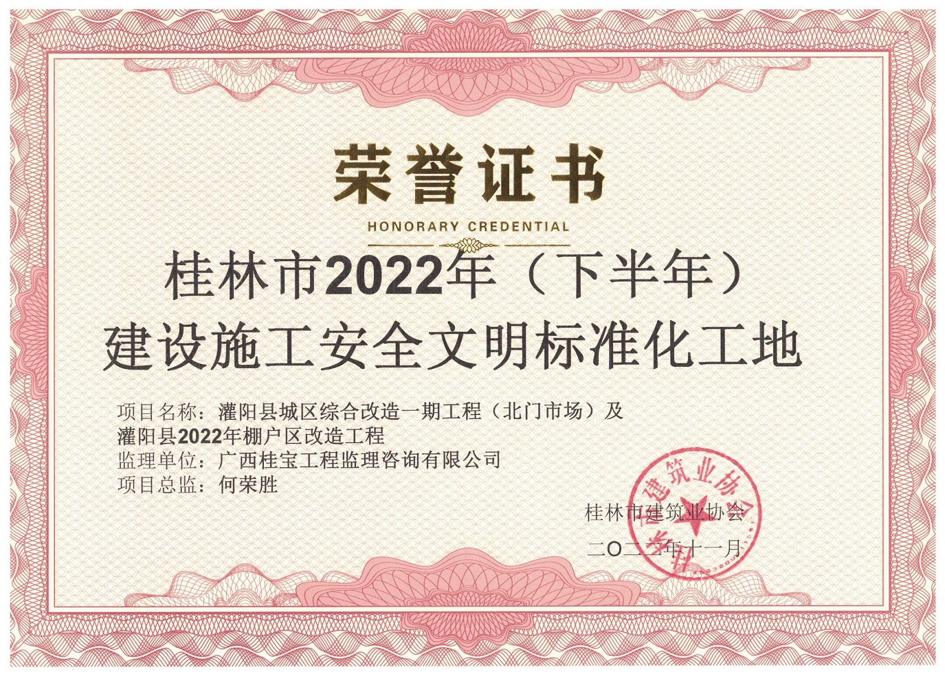 灌阳县城区综合改造一级工程(北门市场)及灌阳县2022年棚户区改造工程获得桂林市2022年(下半年)建设施工安全文明标准化工地