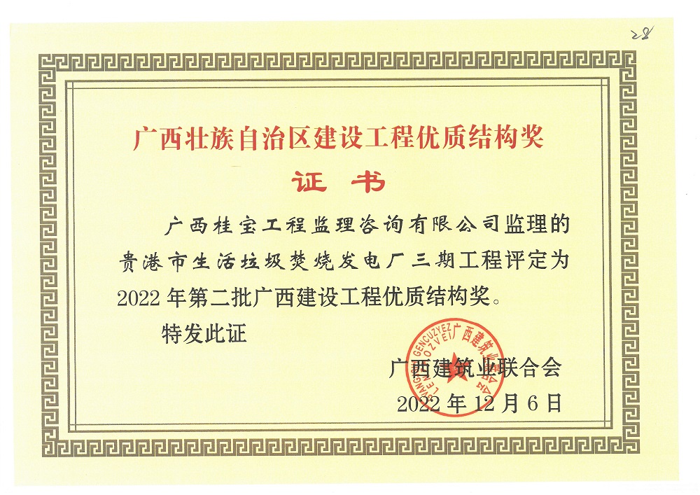 贵港市生活垃圾焚烧发电厂三期工程被评为2022年第二批广西建设工程优质结构奖