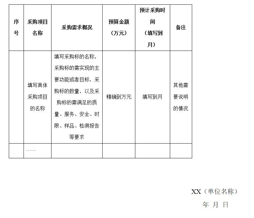 (二)公开内容。包括采购项目名称、采购需求概况、预算金额、计划实施采购时间等,具体填报内容详见附件。