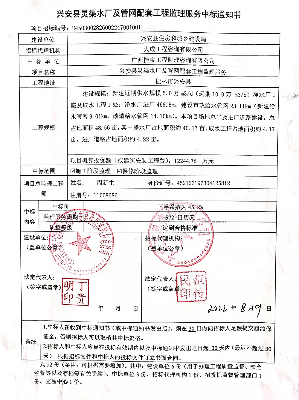 兴安县灵渠水厂及管网配套工程监理服务中标公告