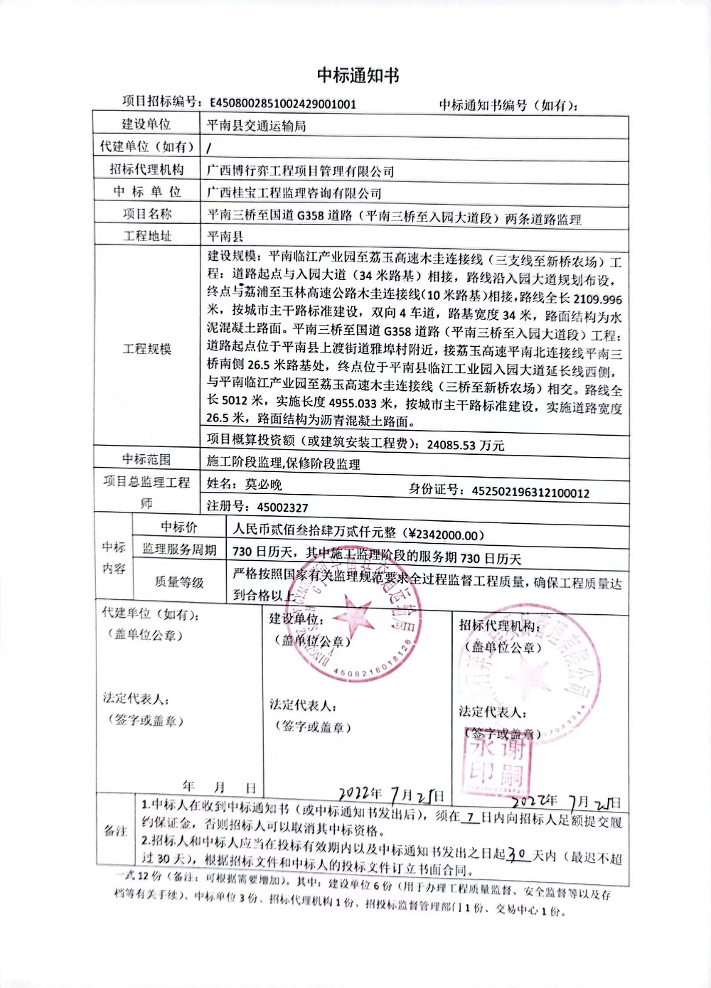 平南三桥至国道G358道路(平南三桥至入园大道段)两条道路监理中标公告