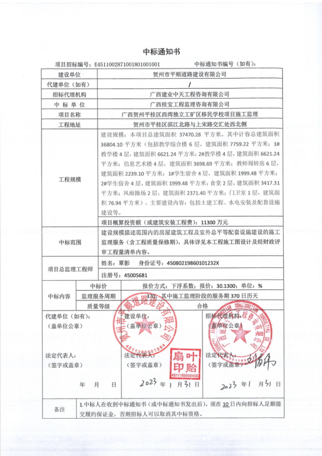 广西贺州平桂区西湾独立矿区移民学校项目施工监理中标公告
