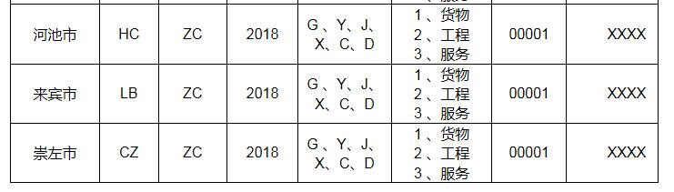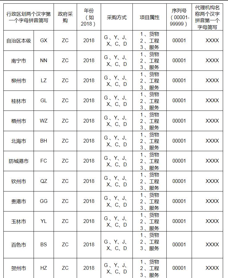 采购项目的编号由“行政区 划 名称+政府采购+年份+采购方式+项目属性+序列号+采购代理机构名称”共七个部分组成。即代表广西壮族自治区行政区 划 名称的拼音简写、政府采购、年份、采购方式、类别、序列号、代表采购代理机构名称的 四 个拼音简写等七部分依次排列组成: