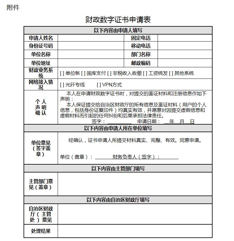 1、本申请表申请者填写部分均为必填项; 2、本申请表不得涂改,涂改无效,请认真填写;3、证书申请者必须向自治区财政厅提交 1份身份证复印件;4、咨询电话: 0771-5323268 ,5331800。