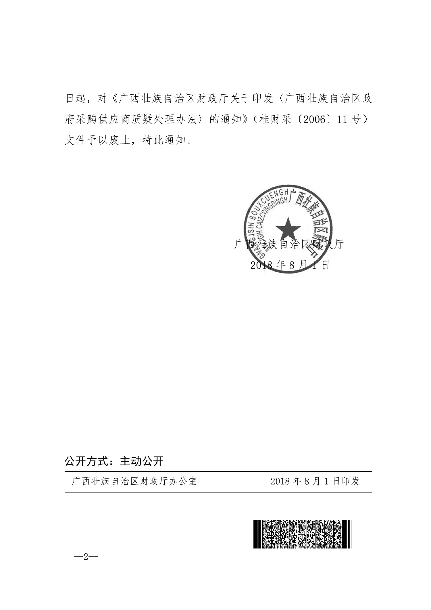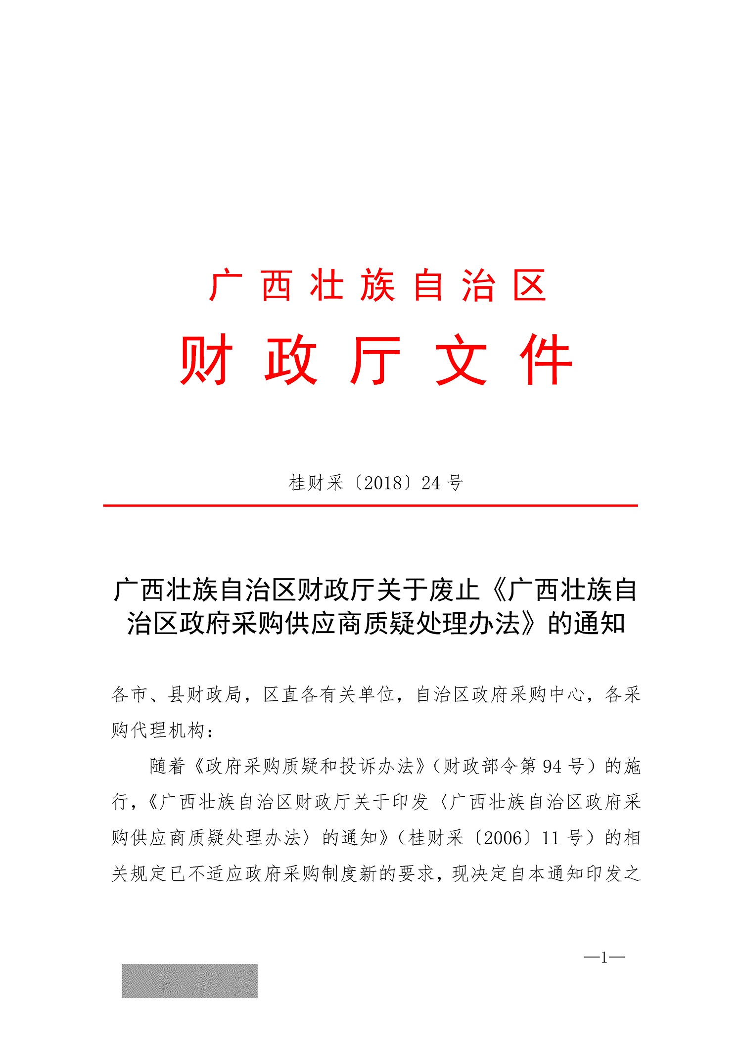 广西壮族自治区财政厅关于废止《广西壮族自治区政府采购供应商质疑处理办法》的通知