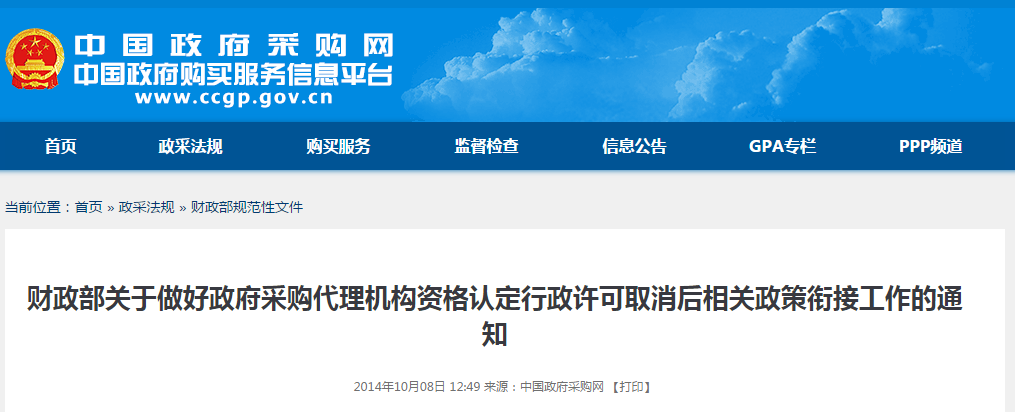 一、自2014年8月31日起,财政部和省级人民政府财政部门不再接收政府采购代理机构资格认定申请,已接受申请的要停止相关资格认定工作。