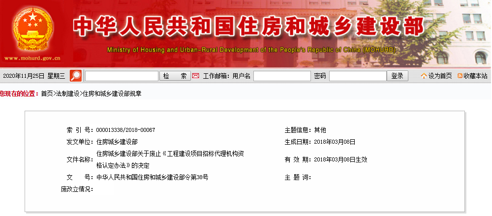 住房城乡建设部决定废止《工程建设项目招标代理机构资格认定办法》(建设部令第154号)。现予发布,自发布之日起施行。